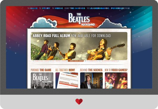 I built the front end (HTML and CSS) of The Beatles: Rock Band website. The website won a Webby Award in 2010 for best games-related site.