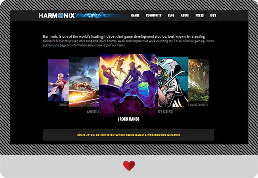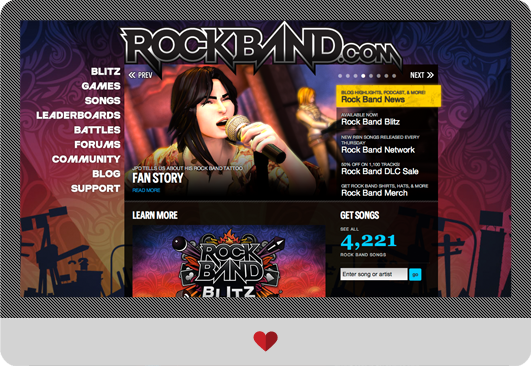 I worked on building out the front end (HTML and CSS) of most of the features of the Rock Band website which was eventually rolled into the Harmonix website. I worked on the visual design of various components of the site but was not responsible for the overall look and feel.